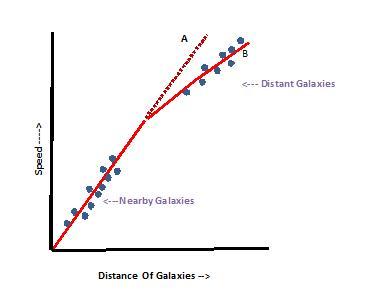 At very great distances, more than around 2 billion light years away, galaxies appear to be moving more slowly away from us (line B) than would be implied by Hubble’s law (line A).