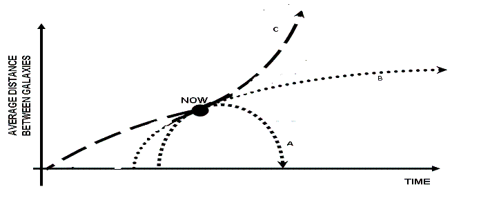 The diagram above shows the how the average distance between galaxies changes with time for a closed Universe (A) and an open Universe (B). We now know that the expansion of the Universe is speeding up (C).