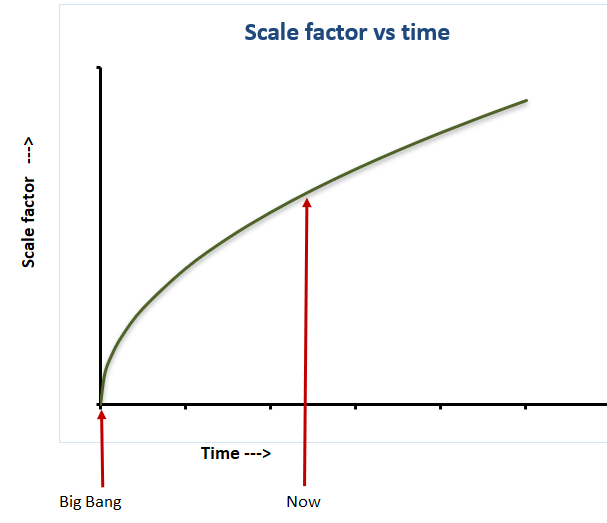 This diagram shows the expansion of the universe has slowed down over time. Along the x-axis is time and the y-axis shows the distance between galaxies. After the initial big bang the Universe expands very rapidly. As time progresses the Universe continues to expand, but at a slower and slower rate, so the distance between galaxies increases more gradually.
