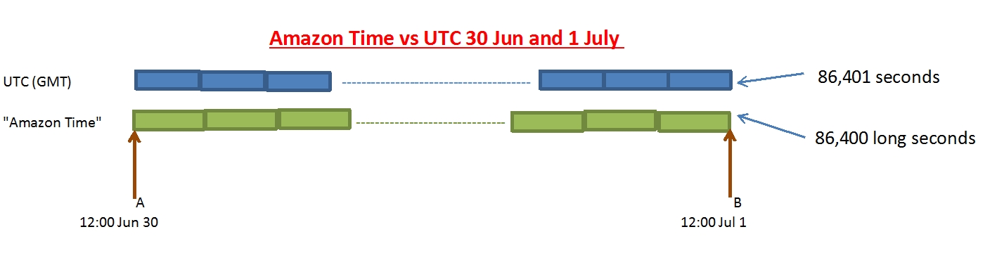 There are normally 86,400 seconds in day, but in the 24 hour period which has a leap second there will be 86,401. By using slightly longer seconds Amazon avoids having to add a leap second, but this means that its computers will be up to half a second out from GMT between 12:00 on June 30(A) and 12:00 July 1(B).