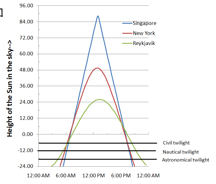 Using this formula the diagram below shown the elevation of the Sun changes throughout the the day on the September Equinox at three places at different latitudes: Singapore (1.5 degrees N), New York (40.5 degrees N), Reykjavik, Iceland (64 degrees N)