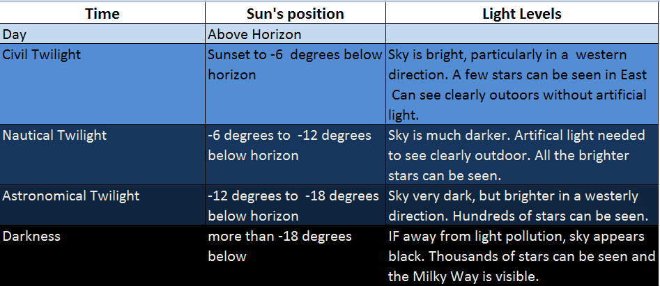 To explain them properly we first need to understand the process of how it gets dark. As discussed in a previous post, twilight is the period of time in the evening or early morning when although the Sun is below the horizon (because it has set or not yet risen) its rays hit the upper atmosphere causing the sky to glow faintly, so it isn’t completely dark. The table below shows the progression from daylight through all the stages of twilight into darkness as the Sun moves further and further below the horizon. It also gives the ‘official’ names for each period of time – for more information about these names, see my previous post here.