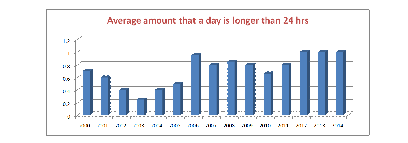 may temporarily speed it up. So although the trend over decades and centuries is that the days are getting longer, over shorter time-scales the average length of a natural day may actually decrease. This is illustrated in the diagram below which shows, in milliseconds, the amount by which the average length of a day was longer than 24 hours for the years 2000 to 2014. (1 millisecond equals one thousandth of a second.)