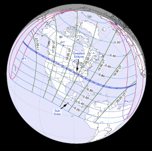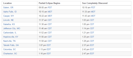 The path of the eclipse as it moved across the US is shown above. The total eclipse began over the Pacific Ocean and reached the Pacific coast of America in Oregon just West of the state capital Salem at 10:16 am local time. The table below shows the eclipse times from some cities which were in its path.