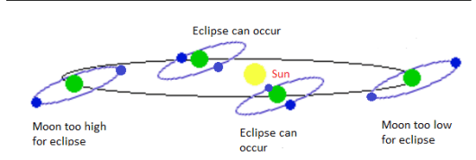 From the diagram above you would expect the Moon to pass in front of the Sun every month and there to be an eclipse every month. This is clearly not the case.