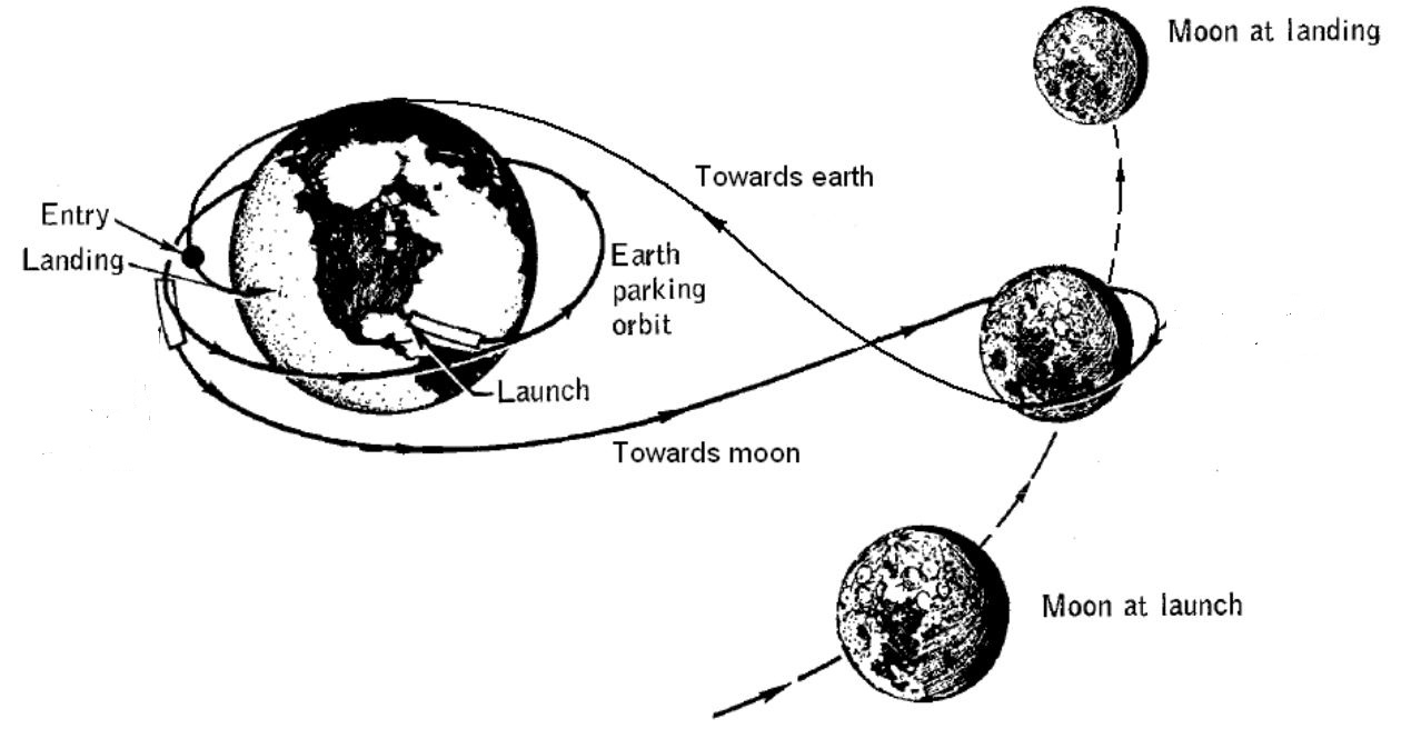 The spaceflight would be likely to follow a path known as free-return trajectory. I’ll talk about free-return trajectories in a later post, but essentially the idea is that it uses the Moon’s gravity to slingshot the spacecraft back to Earth, thus minimising the amount of fuel needed.