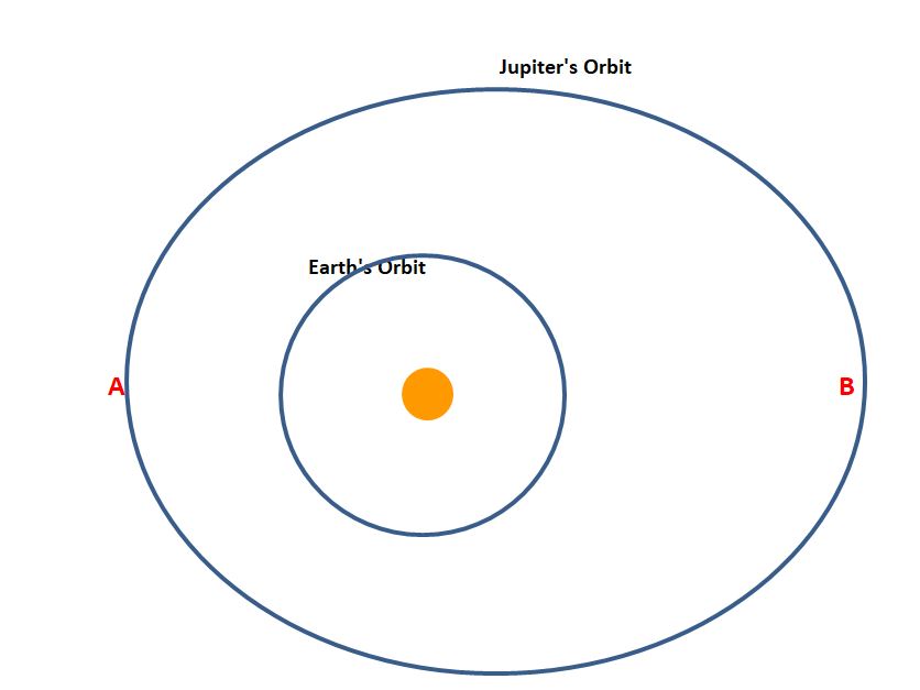 If opposition occurs where Jupiter is closest to the Sun (A,) Jupiter will also be closest to the Earth and brighter than an opposition which occurs where Jupiter is furthest from the Sun (B) In the diagram the elongation of Jupiter’s orbit has been exaggerated.