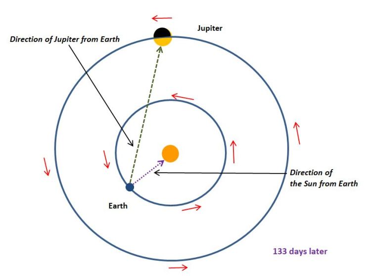 In the diagram below, 133 days later, the Earth has completed more than one-third of its journey around the Sun, whereas Jupiter has done less than 3%. Jupiter appears less bright because it is further away from Earth and not all the sunlit side of Jupiter is facing us. In addition, Jupiter appears fairly close to the Sun and for most of the time is only above the horizon during the daytime, when it is very difficult to see against the brightness of the daytime sky.