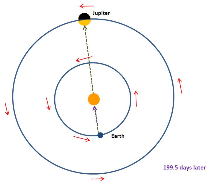 199.5 days later the Earth has completed more than half its journey around the Sun, whereas Jupiter has done just over 4.6%. At this point, which is known as a conjunction of Jupiter and the Sun, Jupiter is only above the horizon in the daytime and is difficult to see because it is so close to the Sun.