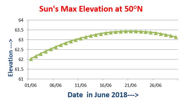 The graph below shows the maximum height, or elevation, of the Sun, measured in degrees above the horizon, during the month of June. The graph is for a location 50 degrees latitude North, which is the same latitude as the southern tip of the British Isles.