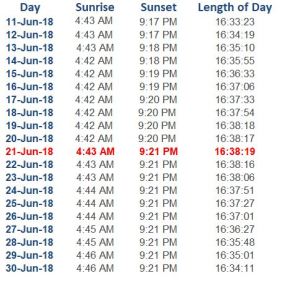 The fact that the Sun’s elevation changes gradually means the amount of daylight also changes very little around the solstice. This is shown in the table below, which gives the sunrise and sunset times and the amount of daylight in hours, minutes and seconds for June in London.