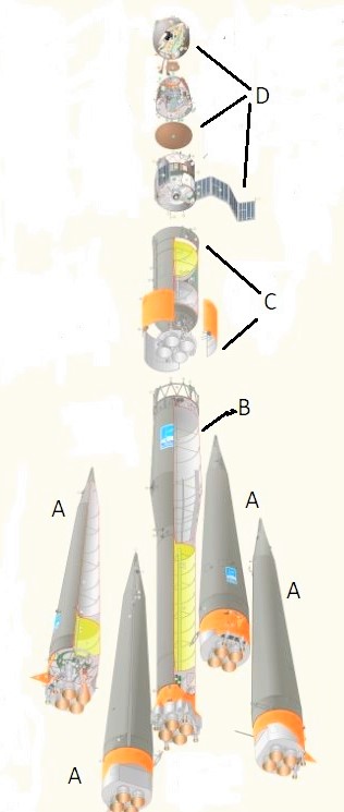 To illustrate what had happened on 11 October the two diagrams below show a Soyuz Rocket at firstly at take-off and in then in an exploded view.