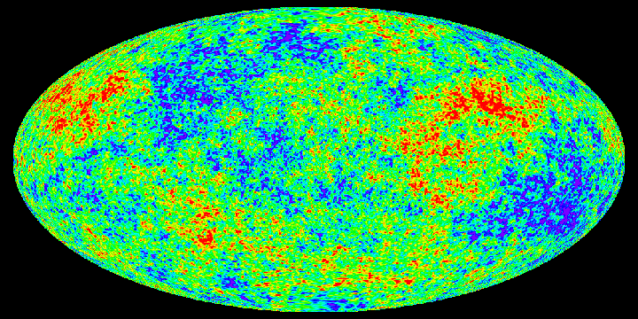 A map of the microwave background from COBE. The red areas show regions where the radiation is slightly stronger  than the average level (shown as green) and the blue areas where the radiation is slightly weaker