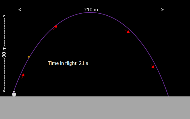 The diagram below shows the path of a baseball thrown on Earth at velocity of 20 metres per second (72 km/h) at an angle of 60 degrees to the ground.