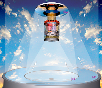 The arrangement of the mirrors is shown below., The concave primary mirror (M1), which collects the light from the sky, is a ring shape and is 8.4 metres in diameter. It has a circular hole 5.1 metres in diameter in the middle. The secondary mirror (M2) is convex and is 3.4 metres in diameter. It is to date the largest convex mirror ever constructed. The 5-metre diameter tertiary mirror (M3) sits inside the primary mirror. In fact, the primary and tertiary mirrors were actually made from the same piece of glass. The camera sits in the centre of M2.