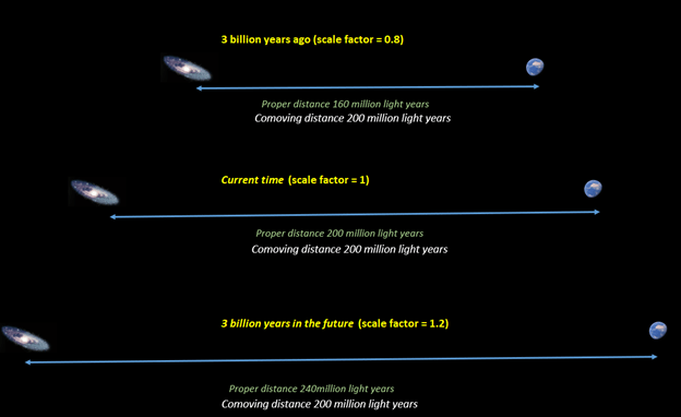 The proper distance isn’t of course directly measurable! It is estimated by using other techniques and making assumptions about the way the Universe is expanding. Because the Universe is expanding, the proper distance between two distant objects (which aren’t held together by gravity) will increase over time. As an illustration: