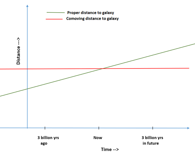 As the Universe expands, the proper distance to the galaxy increases but the comoving distance does not change. This is also shown in the graph below.