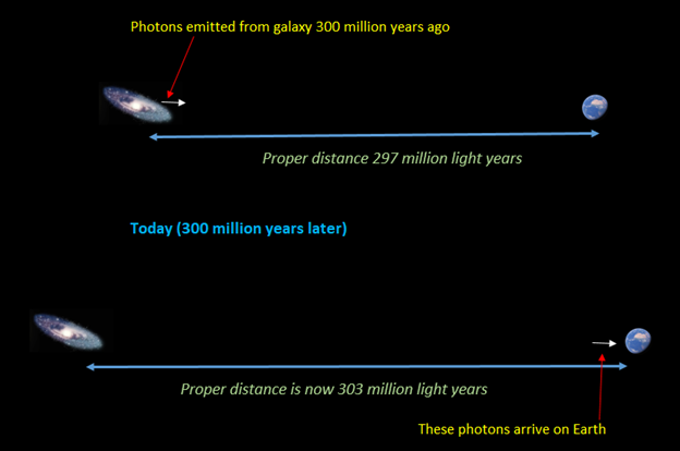 - Suppose that a photon of light is received today from a galaxy, which 300 million years ago was at a proper distance of 297 million light years from Earth.