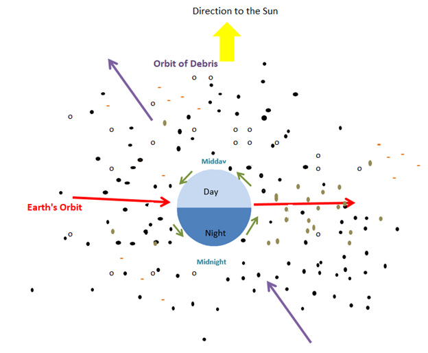 In the hours after midnight, an observer will be on the side of the Earth facing towards the Earth’s direction of travel as it orbits around the Sun. As a consequence, the Earth will scoop up more meteoroids as it passes through space. The time of day when the most meteoroids arrive near a location on Earth is actually around sunrise but at that time the brightness of the sky makes them difficult to see. In general, the best time of day to observe any meteor shower, is in the early hours of the morning just before it starts to get light