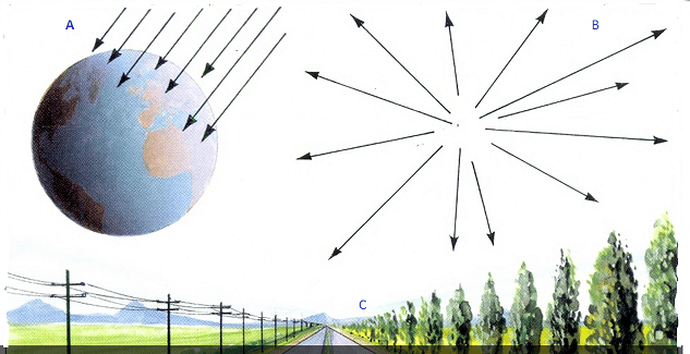 The reason why meteors appear to originate from the radiant is because meteoroids enter the Earth’s atmosphere in parallel paths (A). When these paths are projected onto the two-dimensional dome of the sky then they will all appear to radiate from a particular point in the sky (B) and his point is the radiant. This is analogous to looking at along a straight road , the road, trees running parallel to it and structures such as power cables all appear to converge at a point in the distance (C).