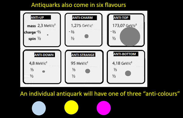 There are also six flavours of antiquark: anti-up, anti-down, anti-charm, anti-strange, anti-top and anti-bottom. Each antiquark will have a colour charge which can be anti-red, anti-blue or anti-green.