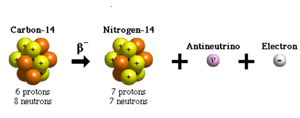 One of the most notable examples of beta decay is when a carbon 14 nucleus changes into a nitrogen 14 nucleus. The half-life of this decay is 5700 years and it is often used for radiocarbon dating