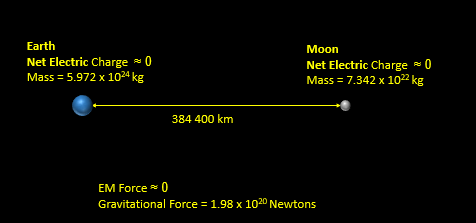 Because the amount of positive and negative charge cancel each other out, the Earth and the Moon have almost zero net electric charge and the electrostatic force (which only acts on charged bodies) is zero. As I’ll explain next the nuclear force and the weak interactions are very short range and it is only gravity which matters at large distances.