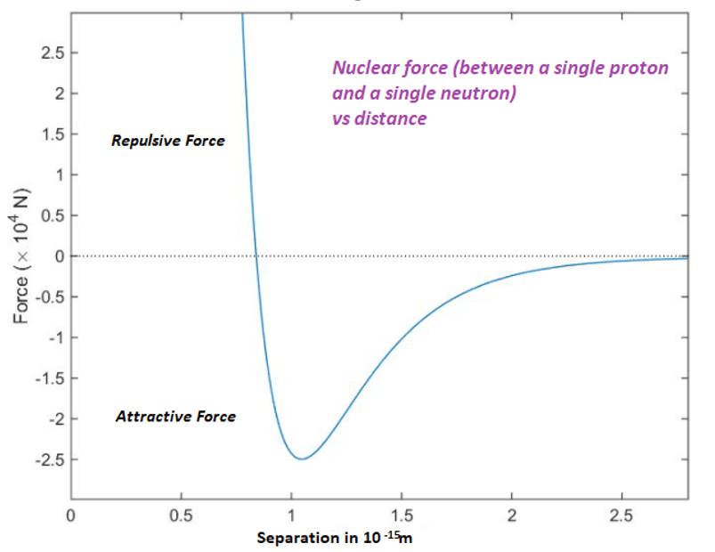 Because nucleons (i.e. protons and neutrons) have no overall colour charge, we might expect that there would be zero strong interaction between two nucleons. This is in general true. However, if two nucleons are very close together (around 10-15 metres) we do get an interaction between them. This occurs when the quarks of one nucleon interact with quarks having a different from a neighbouring nucleon (e.g. the red quark of proton will be attracted to the blue and green quarks of an adjacent neutron ). This is called the residual strong interaction or the nuclear force and is extremely short range, Its strength is effectively zero at a distance of 3 x 10-15 metes. It is the nuclear force which binds protons and neutrons together into atomic nuclei.