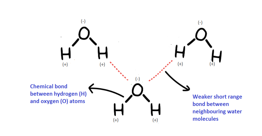 As a whole a water molecule has no net electric charge. However, within the water molecule, the oxygen atom has a small negative charge and the two hydrogen atoms each have a small positive charge. This causes a weak force between the oxygen atom of a water molecule and the hydrogen atoms of its neighbours