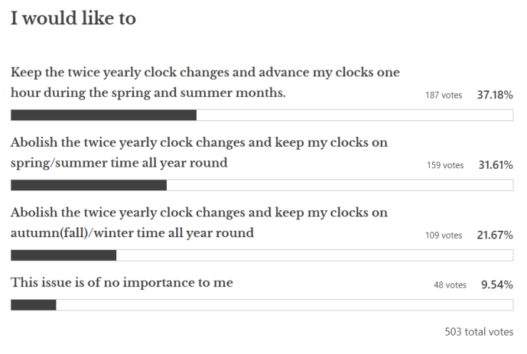 As you can see, none of the three options gained more than 50% of the vote. Although there is a clear majority for abolishing the twice-yearly task of advancing the clocks in spring and then putting them back in autumn(fall), there is no overwhelming majority for remaining on daylight saving time all year round. A substantial minority would like to remain on permanent winter time.