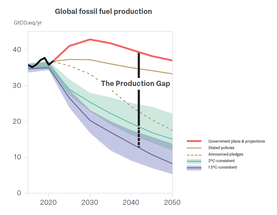 A recent UN report pointed out that the government plans and projections from the major fossil fuel producers would lead to an increase in global coal production until 2030, and in global oil and gas production until at least 2050. This conflicts with national commitments under the Paris Agreement, and the widely-held expectation that global demand for coal, oil, and gas will peak within the 2020’s and then fall rapidly.