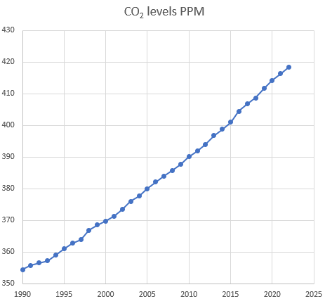 My pessimistic view is that this won’t happen. In the past decades, short term national interest has taken priority over doing what is needed to reduce global warming.  A good illustration that not enough has been done is the graph below. This shows the annual average carbon dioxide levels for the years from 1990 to 2022.