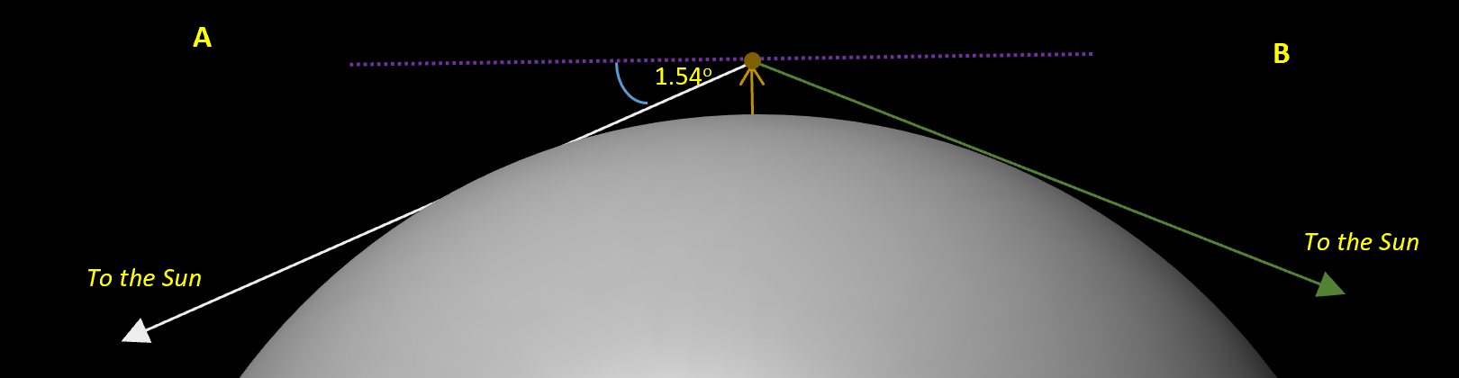 The dark brown circle marks a location near the Moon’s poles 630 metres above the lunar surface. Near the lunar winter solstice, the Sun is at its lowest elevation, 1.54 degrees below the lunar horizon, but is still visible from this location – shown as A. During the lunar day the Sun moves in a circular path around the lunar sky but seen from the dark brown circle it never drops below the horizon. Half a lunar day later, the Sun appears in the opposite direction – shown as B.