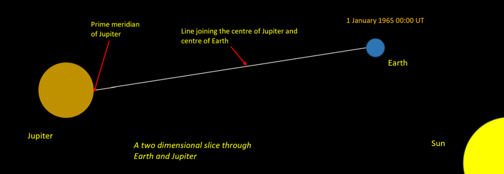 The most widely used definition of the prime meridian is known as the Jupiter System lll. In this system, zero longitude is based upon the line joining the centre of the Earth and the centre of Jupiter at 00:00:00 UT on 1 January 1965. The location of the prime meridian at a given time can be calculated by assuming the planet rotates once every 9h 55m 29.711s. (source https://lasp.colorado.edu/mop/files/2015/02/CoOrd_systems7.pdf )