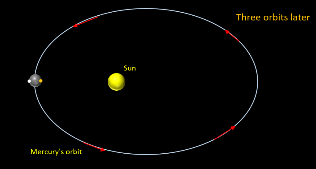 One complete orbit later, Mercury has rotated on its axis exactly one and a half times. The orange dot represents the new location (second hot pole) where the Sun is directly overhead. The original hot pole is on the directly opposite side of Mercury.