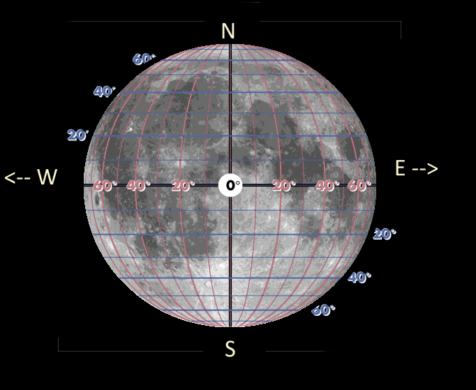 Moon maps before the advent of space probes were drawn from the viewpoint of someone looking at the Moon from the Earth. So, from the early days of lunar mapping, the Moon’s prime meridian was naturally chosen to pass through the centre of the Moon’s near side.