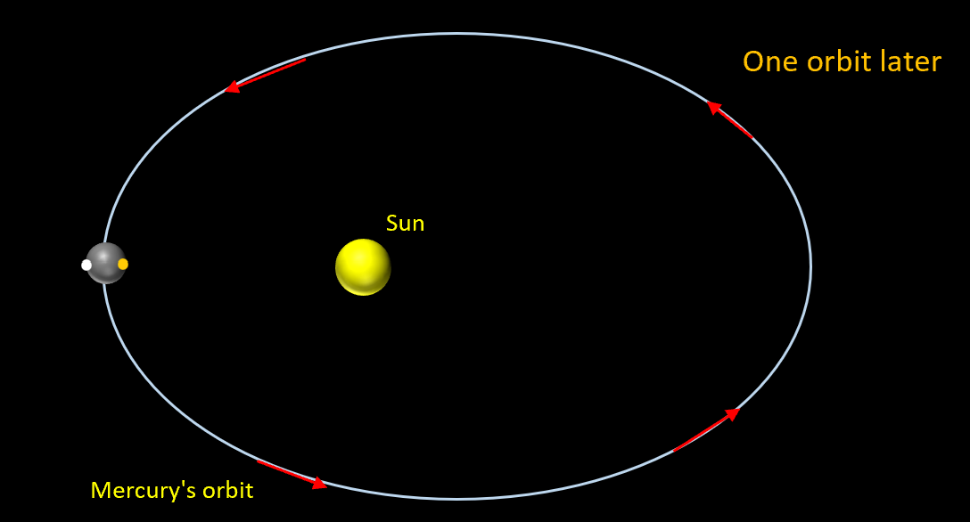 One complete orbit later, Mercury has rotated on its axis exactly one and a half times. The orange dot represents the new location (second hot pole) where the Sun is directly overhead. The original hot pole is on the directly opposite side of Mercury.