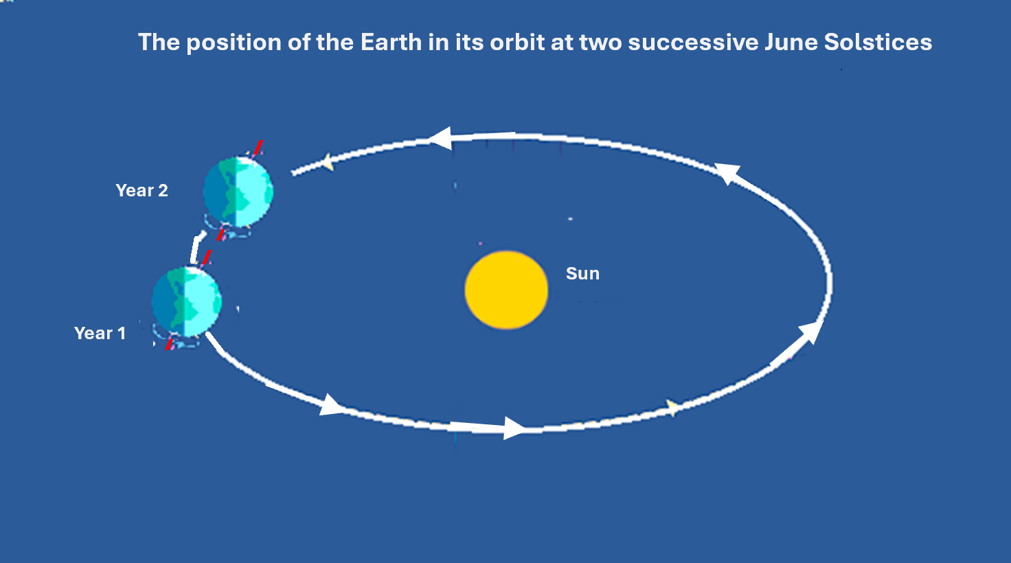 If we consider the June Solstice, when the Earth’s North Pole is at its maximum tilt toward the Sun, precession means the Earth needs to perform slightly less than one orbit for the North Pole to be at its greatest tilt again.