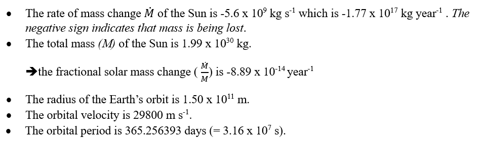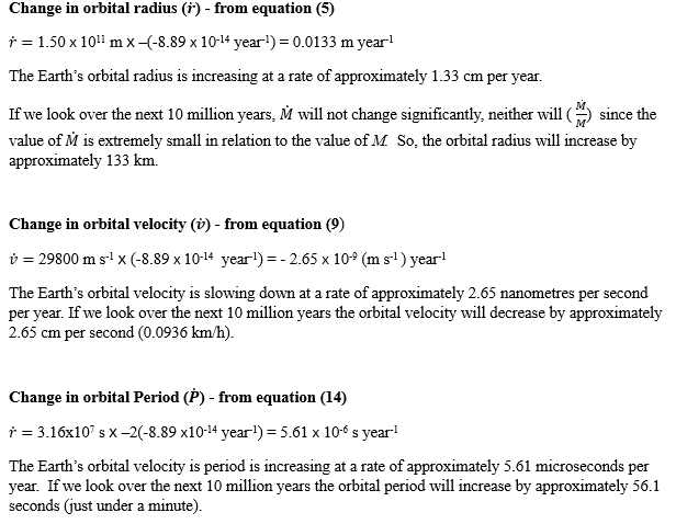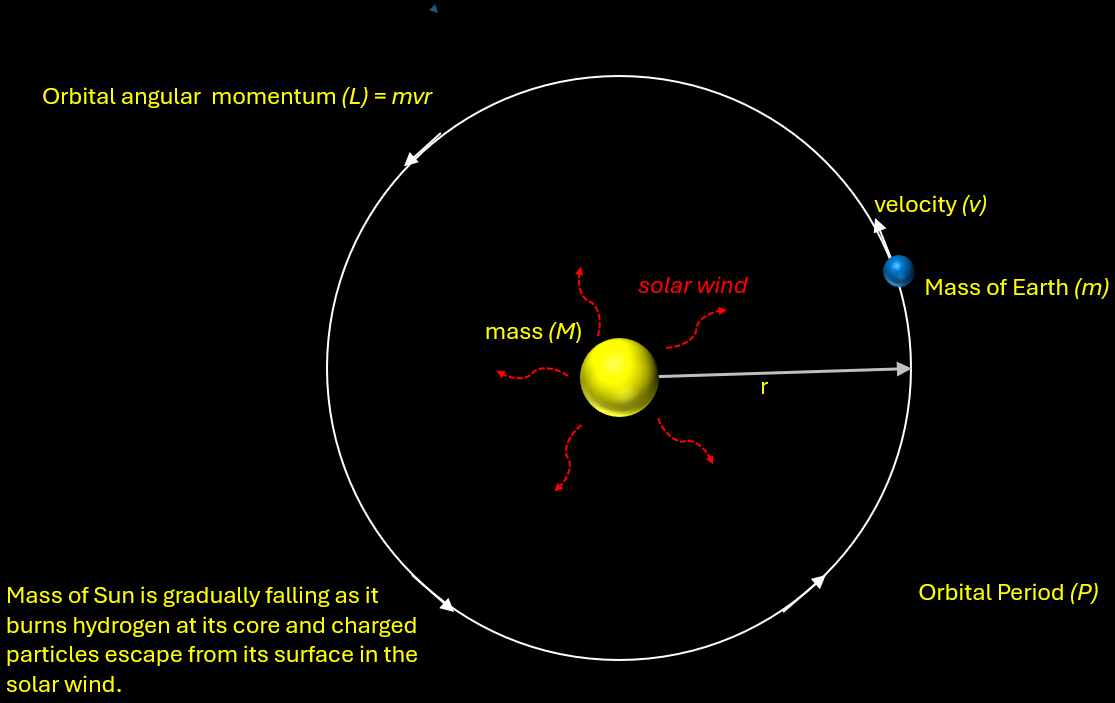 As the Sun loses mass its gravitational pull on the Earth weakens, as a result the Earth spirals out to a higher orbit, its orbital speed slows and its orbital period lengthens. To calculate the magnitude of these changes we use the fact that the changes to the Earth’s orbit must obey the law of conservation of angular momentum.