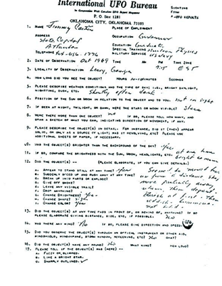 Jimmy Carter UFO sighting Here is the UFO sighting report filed by Jimmy Carter back in 1969 when he was governor of Georgia This was very likely to have been a sighting of Venus as explained here. Share this: Click to email a link to a friend (Opens in new window) Email Click to share on LinkedIn (Opens in new window) LinkedIn Click to share on X (Opens in new window) X Click to share on Facebook (Opens in new window) Facebook Click to share on Pinterest (Opens in new window) Pinterest Like Loading...