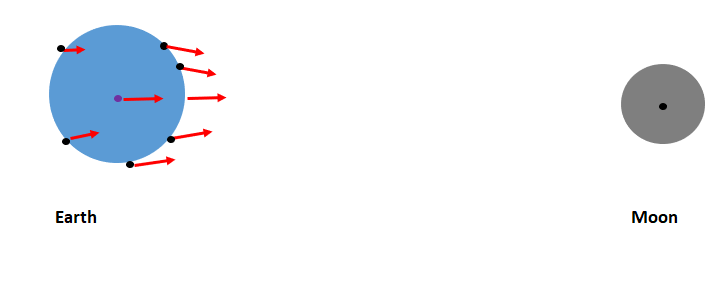 The diagram shows a two-dimensional slice through the Earth-Moon system. The point marked with a purple dot is the centre of the Earth. Other locations on the Earth are marked with a black dot. At each location, the direction of the red arrow marks the direction of the Moon’s gravitational field and the length its magnitude.